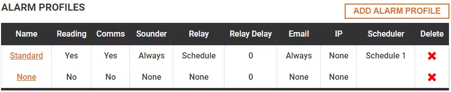 Alarm profiles are used to control the actions the D3 base station will take in the event of an alarm event being triggered. Alarms are triggered when data received exceeds the limits of your set points (after any alarm delay you have allowed has elapsed).