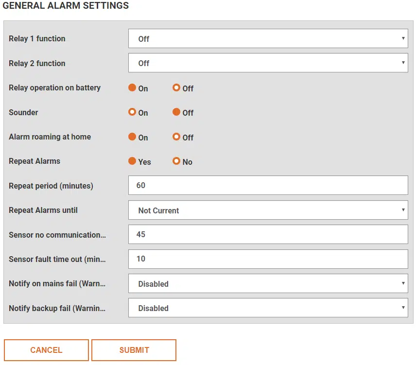 The basic alarm function of the D3 are controlled in the General Alarm Settings. When setting alarm profiles it is essential that relevant items are also set to operate in the general settings. For instance, if an alarm profile has an output relay set but in general settings relays are off, then the relay will not action on alarm.